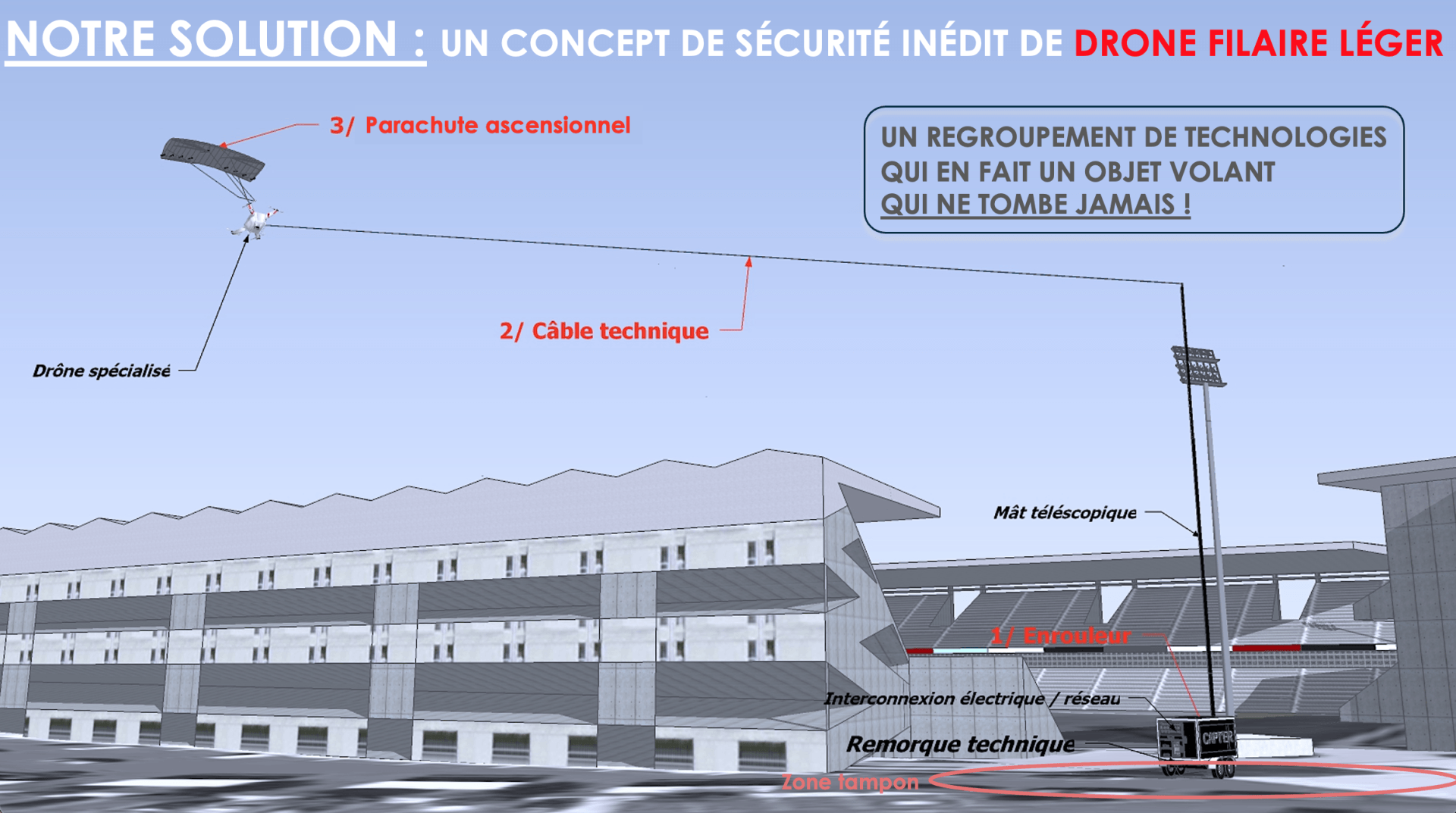 Hypérion 7, a développé un système de sécurité unique permettant de survoler un public dispersé et n'importe quelles infrastructures sans risque de chute.